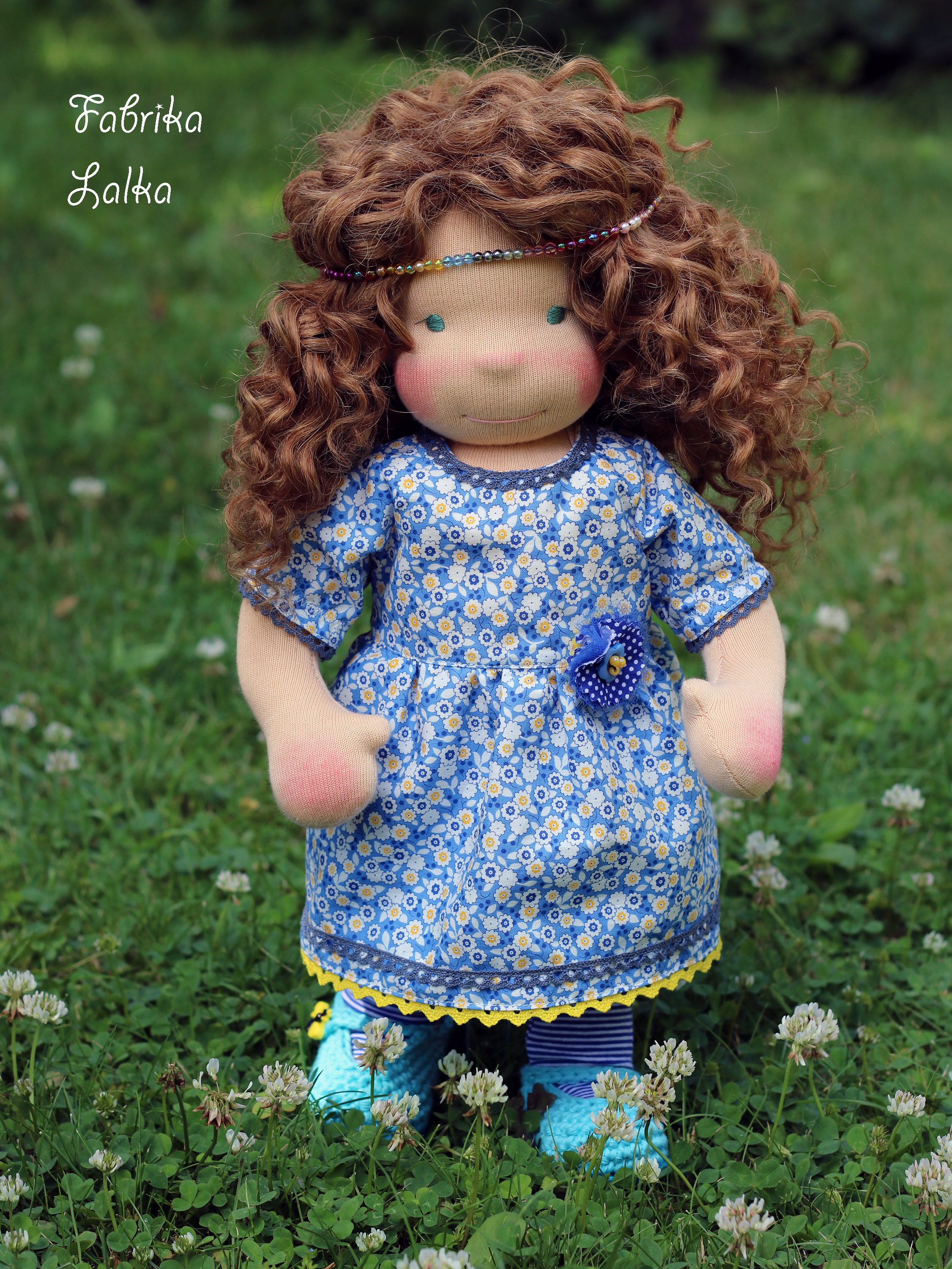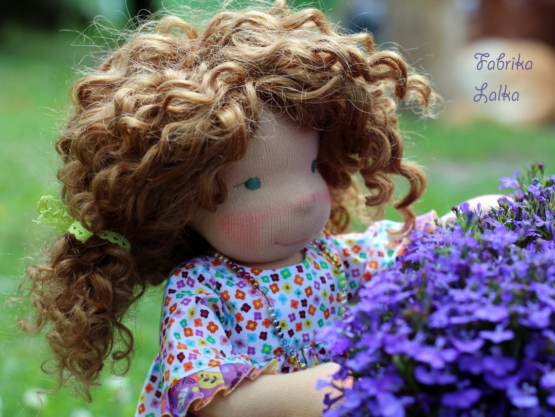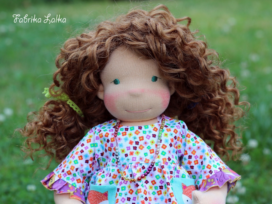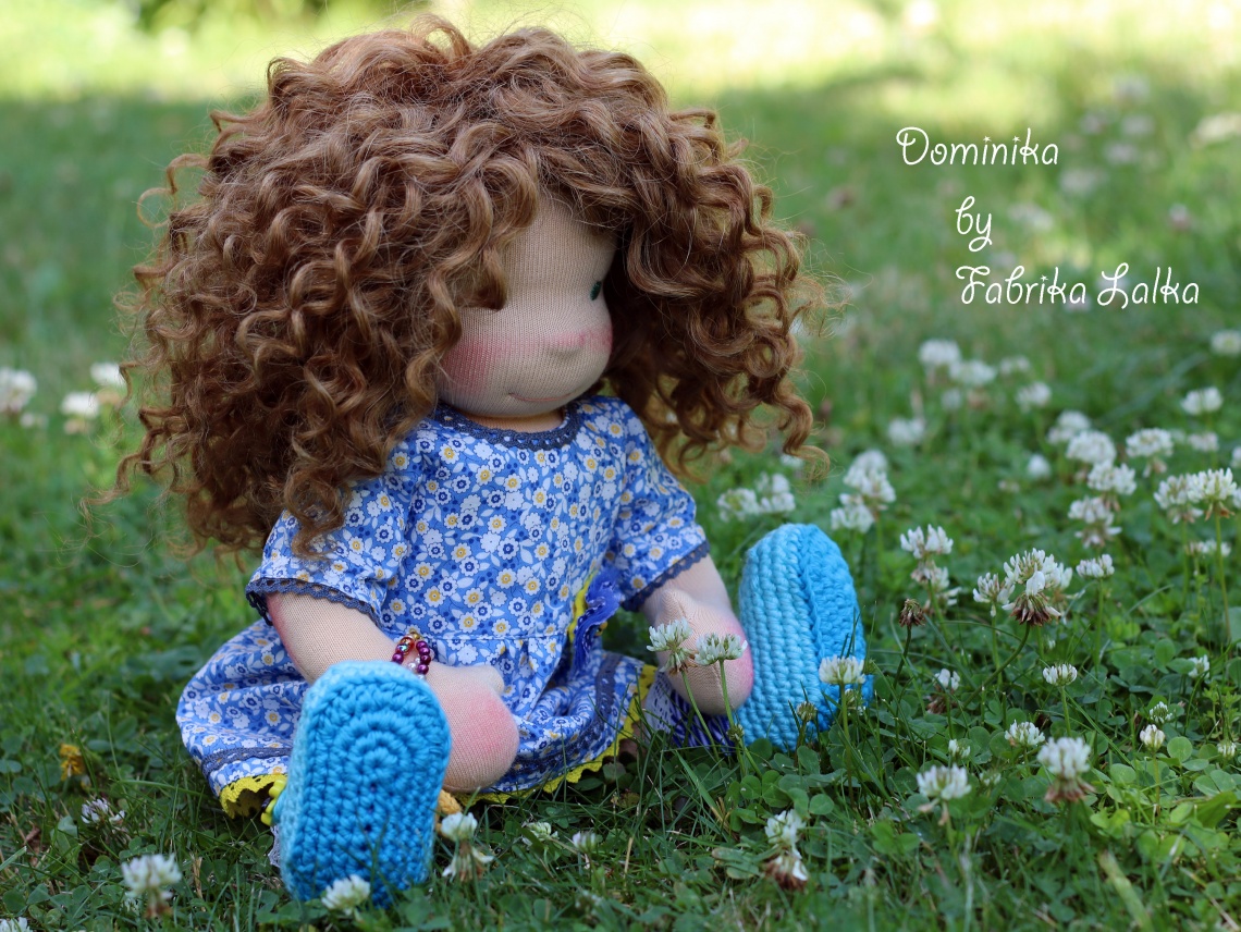 Praca na ubrankami Dominiki to była prawdziwa przyjemność. W tkaninach z których powstały od dawna jestem zakochana. Ubranka mają subtelne ozdoby, delikatne koronki, kolorowe guziki, broszkę w kształcie kwiatka. Chciałam zrobić Dominice sukienkę z kołnierzykiem, i bufiaste rękawki. Ale nie pasowałoby to to jej bujnych włosów. Miałam zrobić jej kolorową czapkę, ale szkoda by było chować pod nią jej loki. Chociaż początkowe plany z ubrankami się zmieniły, wcale nie żałuję, bo uwielbiam jej włosy i dodają jej prawdziwego uroku.